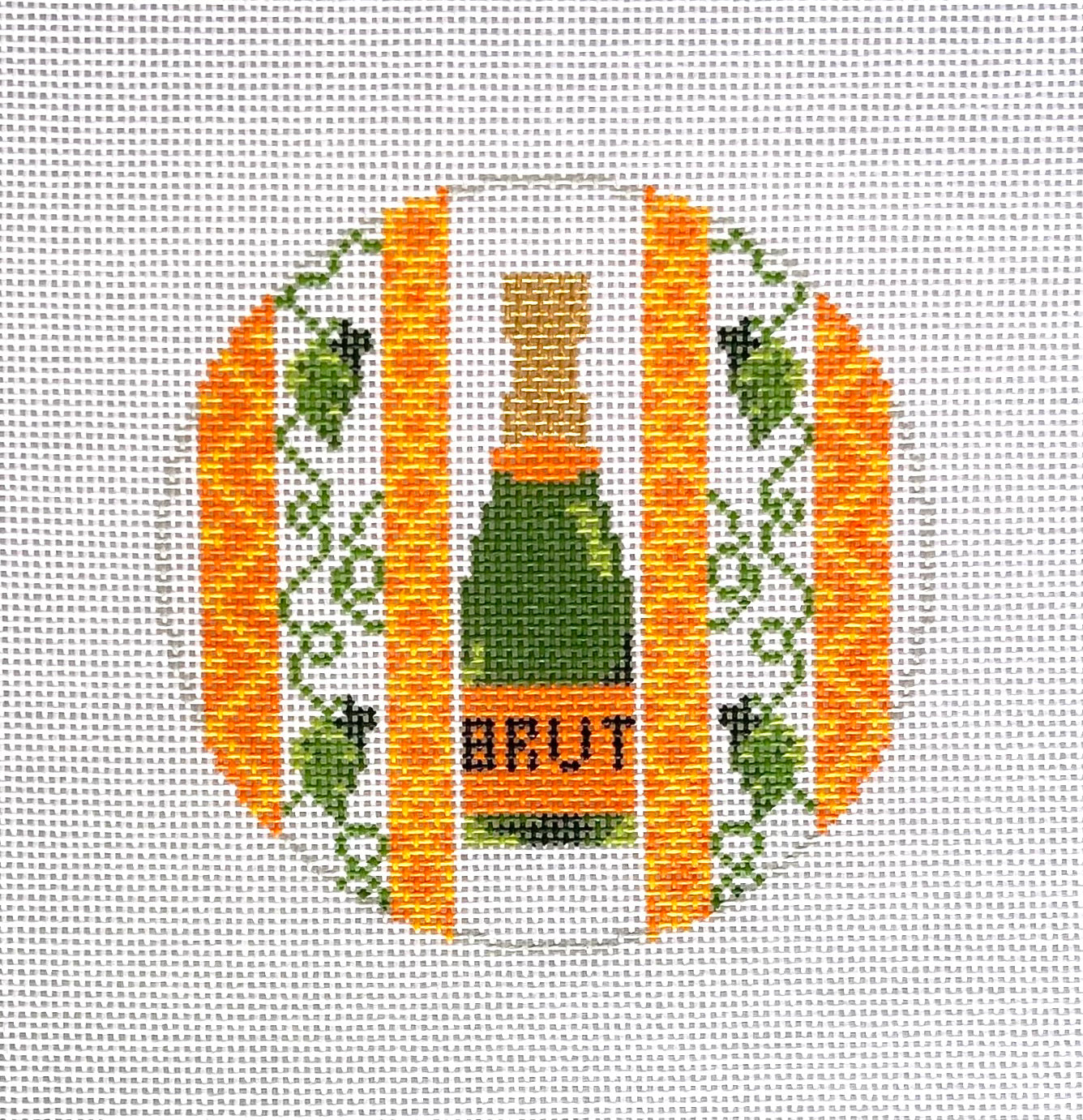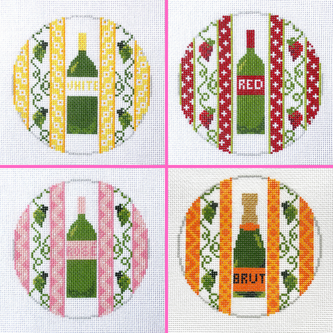 This 4" round coaster was designed to be part of a set, joining our red, white, and rosé coasters, to fit (once finished) into an acrylic round wine bottle coaster. The acrylic bottle coasters open and close, so the needlepoint piece could be swapped out at any time to reflect which wine is being served. These finished canvases would, of course, work equally as well as a plain coaster for a glass of champagne--or even an ornament for your tree! AOK 129