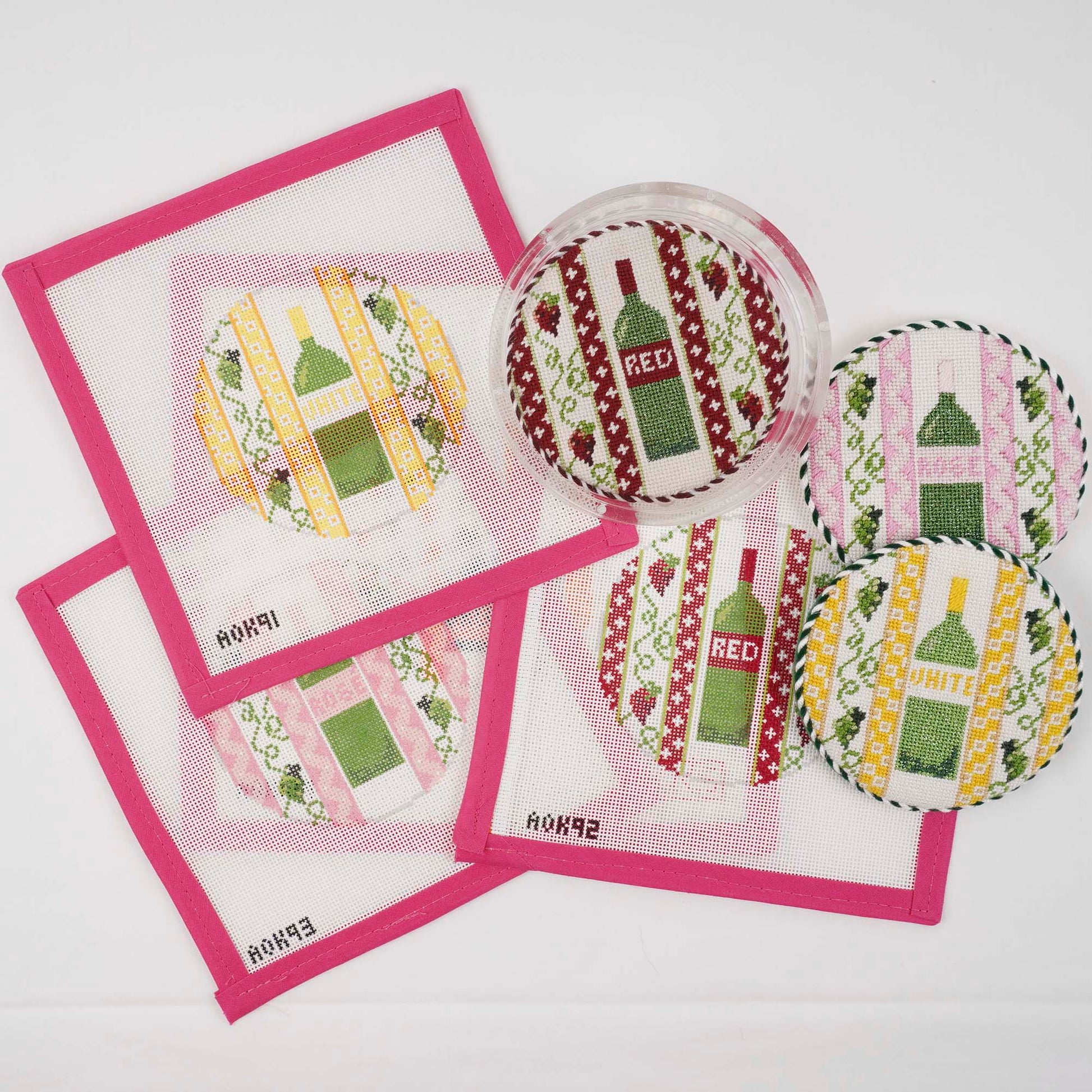 This 4" round coaster was designed to be part of a set, joining our red, white, and rosé coasters, to fit (once finished) into an acrylic round wine bottle coaster. The acrylic bottle coasters open and close, so the needlepoint piece could be swapped out at any time to reflect which wine is being served. These finished canvases would, of course, work equally as well as a plain coaster for a glass of champagne--or even an ornament for your tree! AOK 129