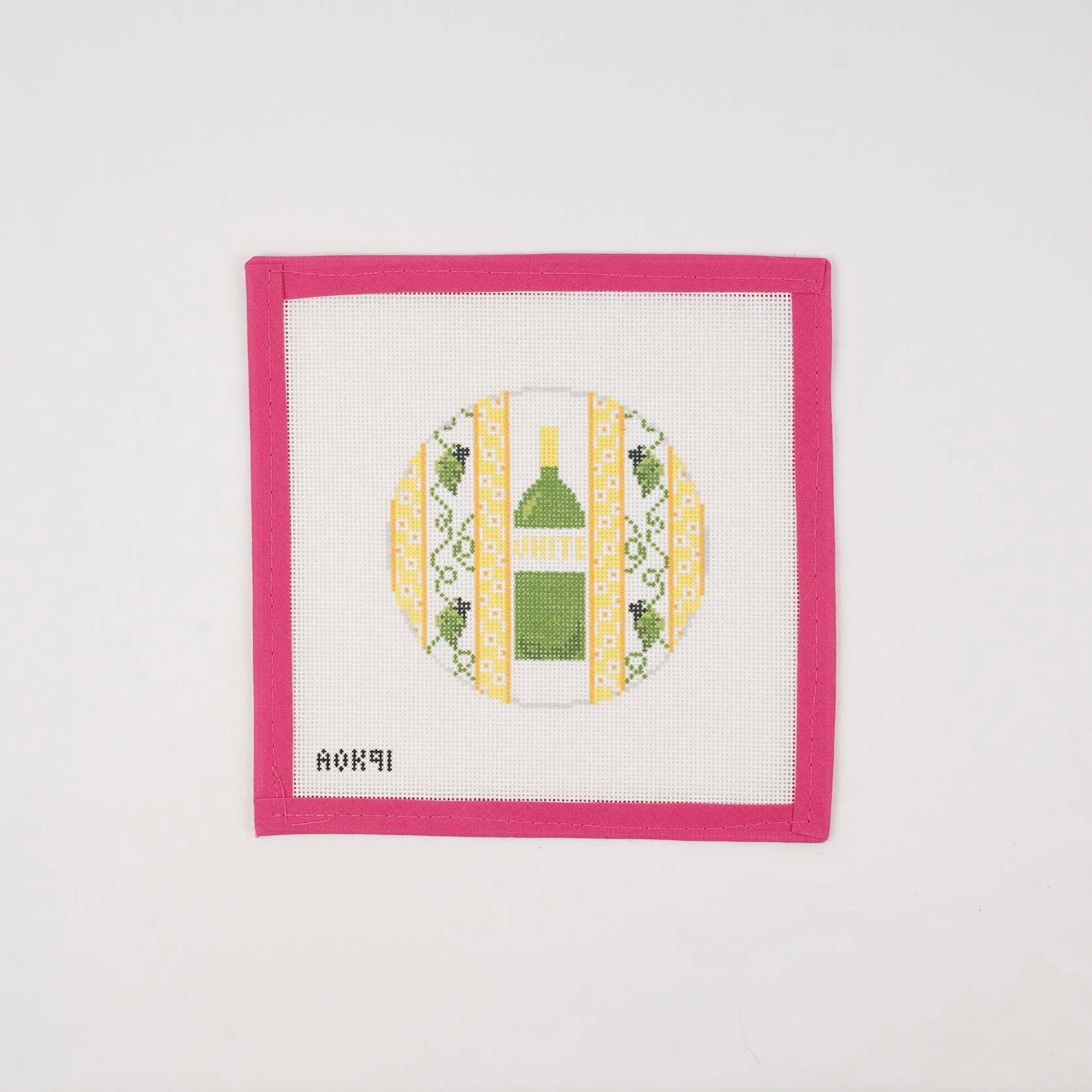 This 4" round coaster was designed to be part of a set, along with Red and Rosé, to fit (once finished) into an acrylic round wine bottle coaster. The acrylic bottle coasters open and close, so the needlepoint piece could be swapped out at any time to reflect which wine is being served. These canvases finished would, of course, work equally as well as just a plain coaster for a glass of wine. AOK 91