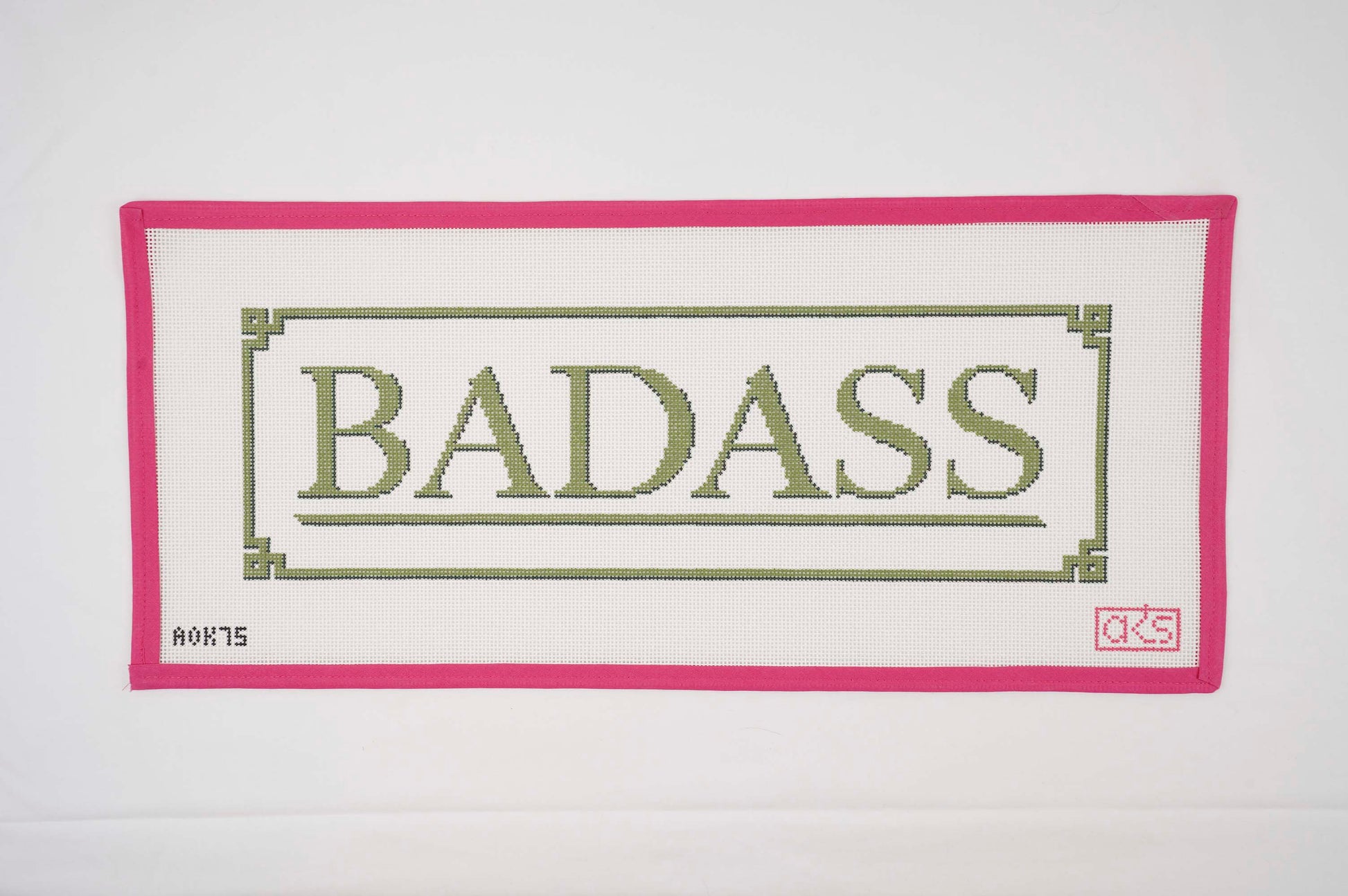 Feeling good about yourself today? Then you need this canvas! In this bold design, the word BADASS appears in green in the middle, surrounded by a fun Greek-key-inspired border. The design area is approximately 16 3/4” x 5 1/2“ — perfect for a long bolster pillow to go on a chair or the center of a couch. The canvas dimensions are 21 3/4” x 9 1/2” on 13 mesh. AOK 75