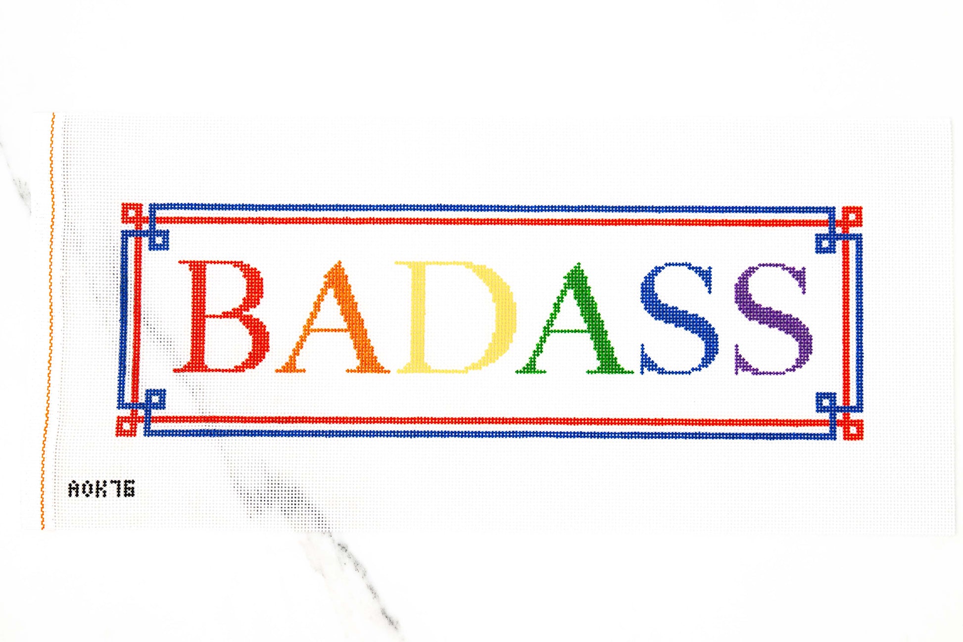 Feeling good about yourself today? Then you need this canvas! In this bold design, the word BADASS appears in a rainbow of colors in the middle, surrounded by a fun Greek-key-inspired border. The design area is approximately 16 3/4” x 5 1/2“ — perfect for a long bolster pillow to go on a chair or the center of a couch. The canvas dimensions are 21 3/4” x 9 1/2” on 13 mesh. AOK 76