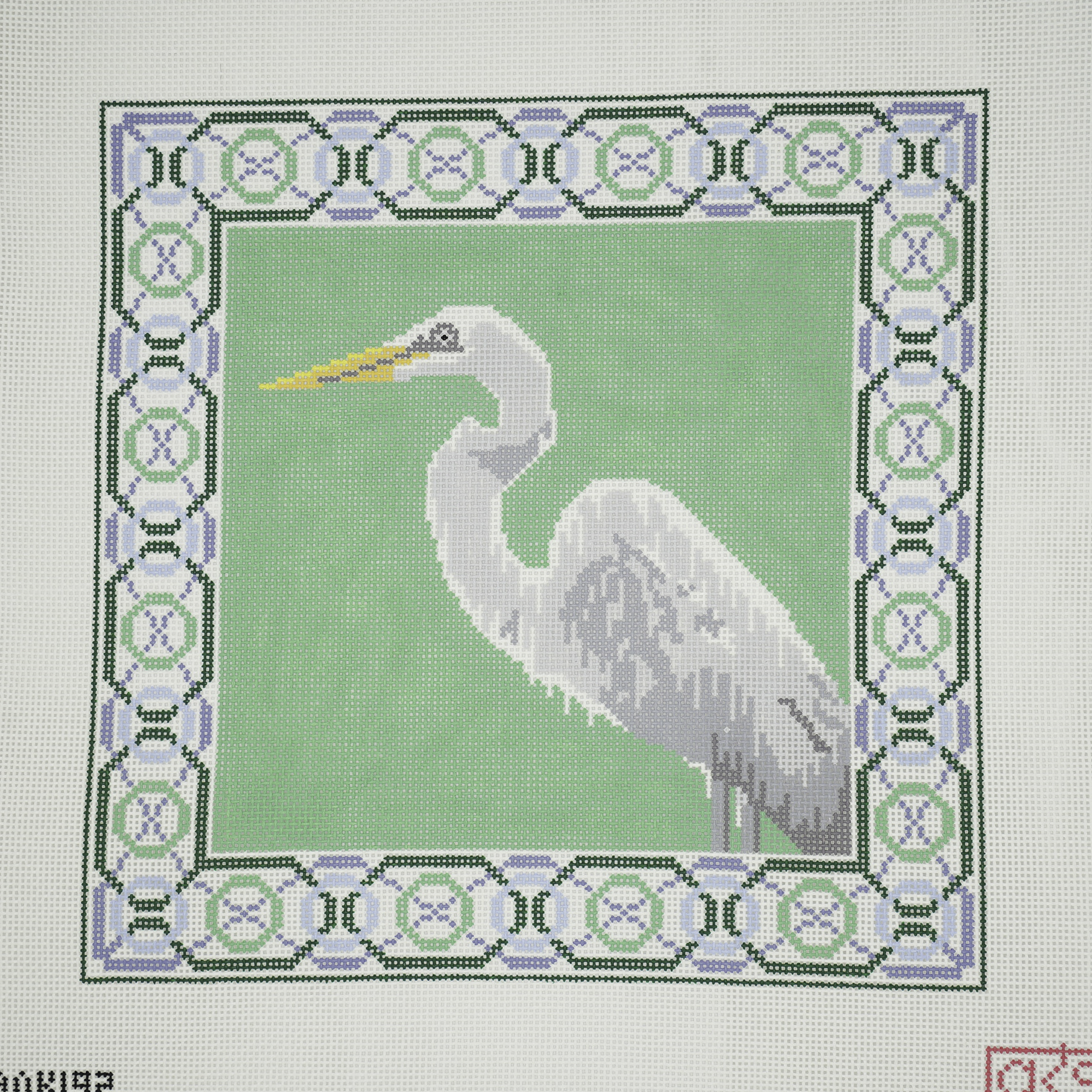 Introducing a fresh new take on our egret pillow! This 11.6” square design on 13 mesh has a beautiful geometric border in blues and greens framing the egret on a field of green. AOK 192