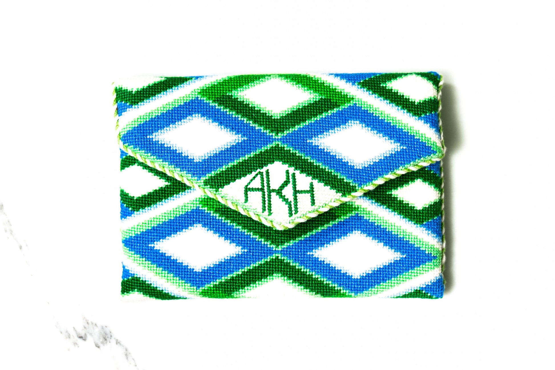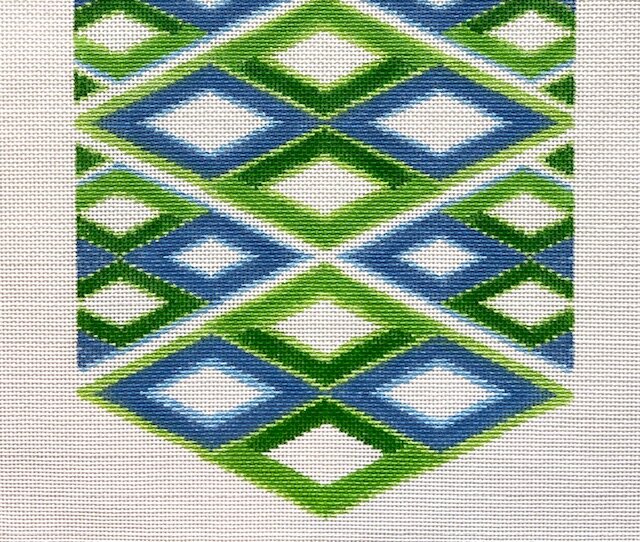 This stunning design can be folded and finished as a flat clutch, or end pieces can be added to give the clutch some dimension. There is space to personalize this with your monogram if you’d like. The design is approximately 17” (length) x 9” (width) on 13 mesh. After being folded and finished, the clutch will be approximately 7” (height) x 9” (width). AOK 59