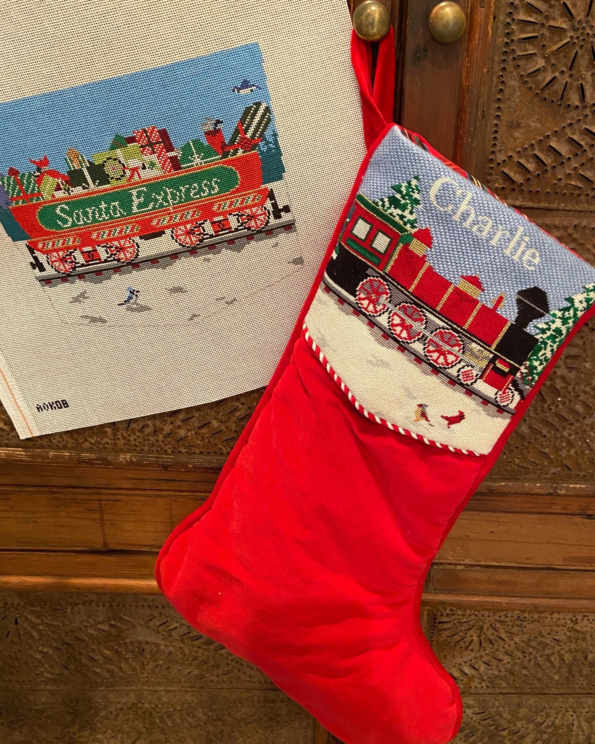 This Santa Express Stocking Cuff is the perfect companion piece to our Locomotive Stocking Cuff, appropriate for child number two. The coal to power the train has been replaced with toys for good girls and boys. Like the Locomotive, this design is approximately 9” wide by 7” tall, and is on 18 mesh. There is room in the sky to personalize this canvas with a child’s name, or you can add one of our Stocking Name Tags. AOK 08