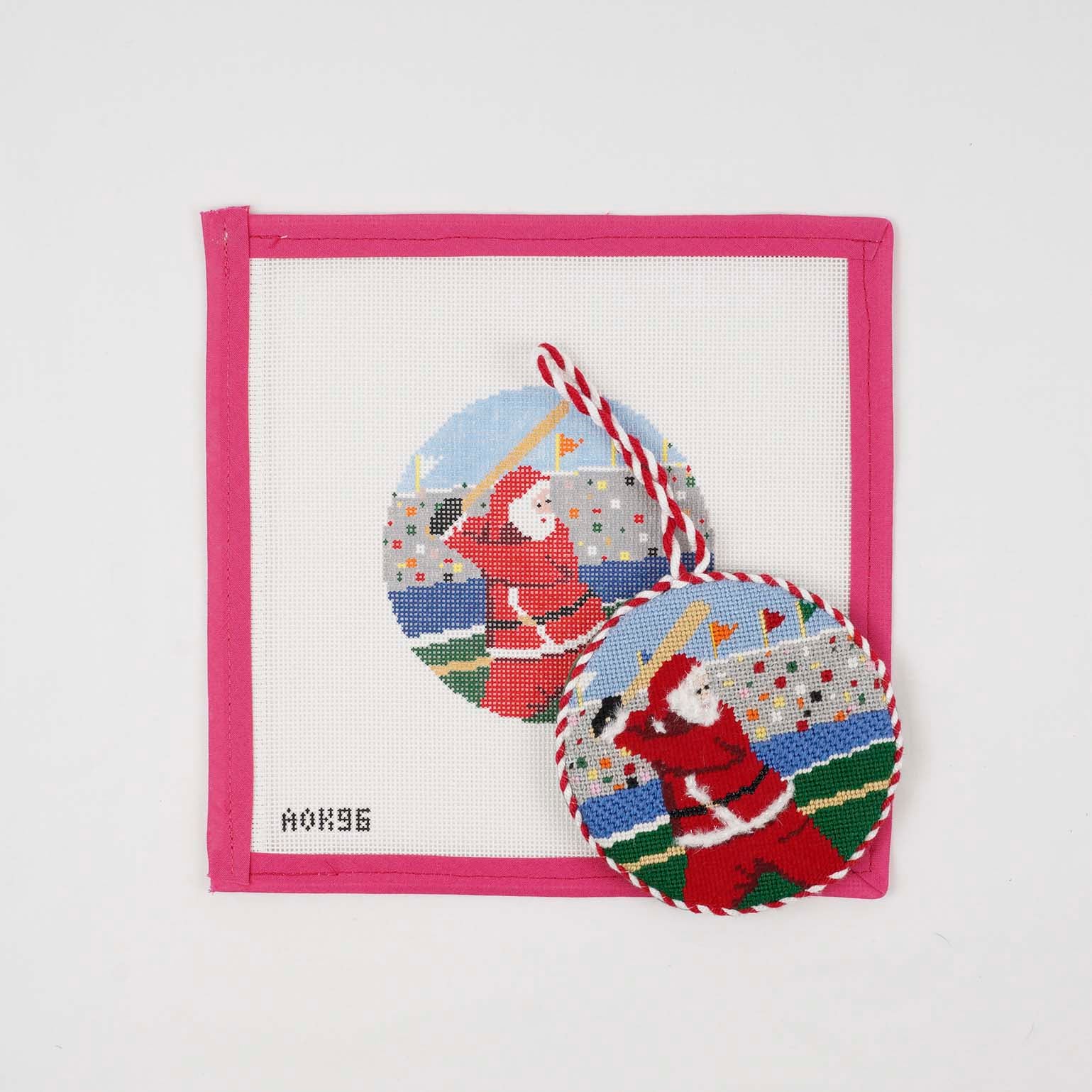Hey, batter, batter, batter! Santa swings for a home run on this 4” round ornament hand-painted on Zweigart mono 18 mesh canvas. AOK 96