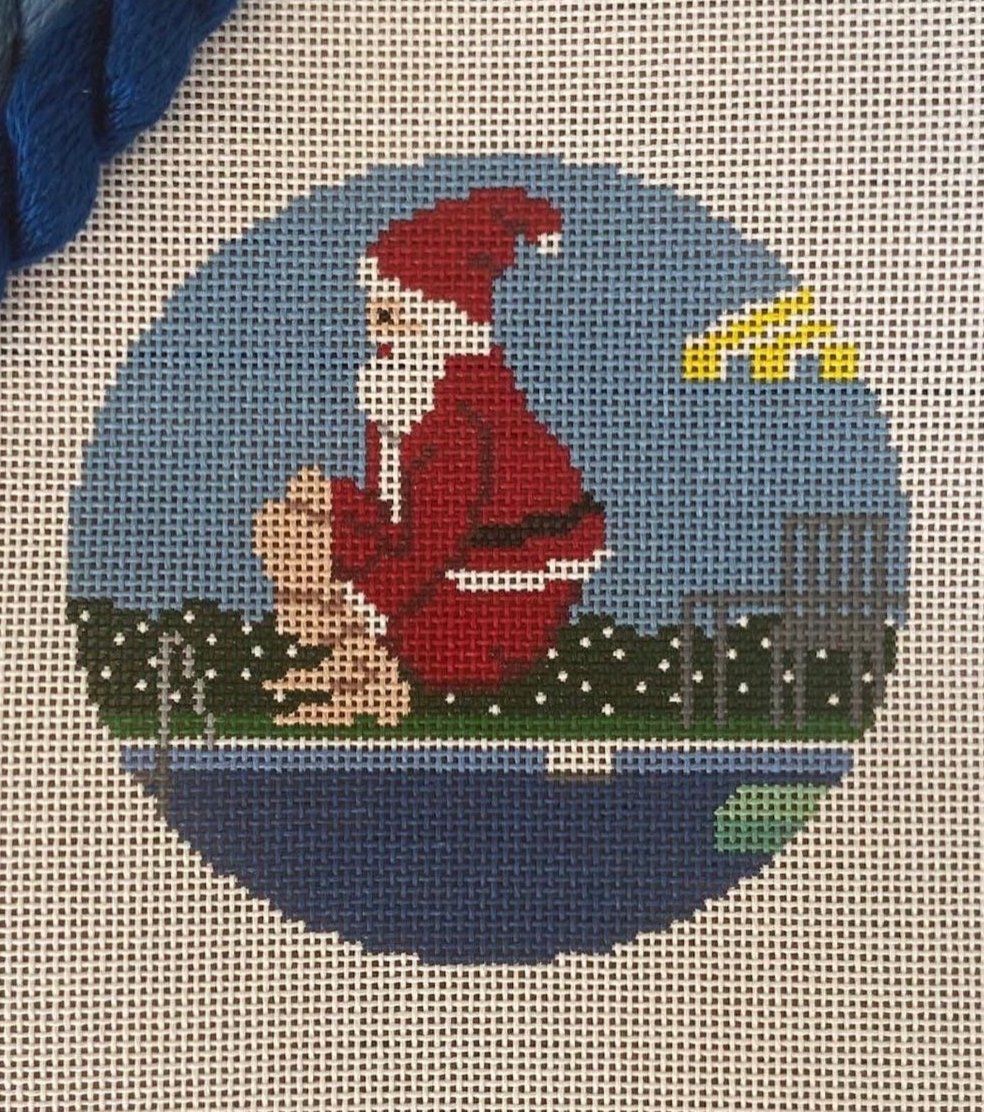 This Sporty Santa makes a big splash! Cannonball Santa is a 4” round on 18 mesh. AOK 82