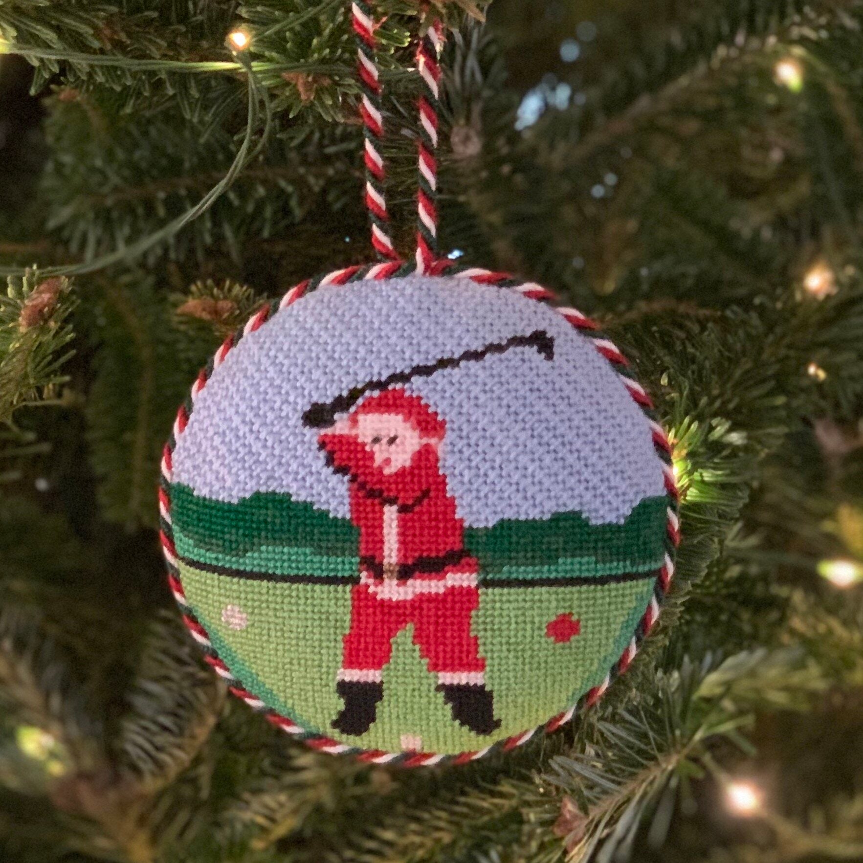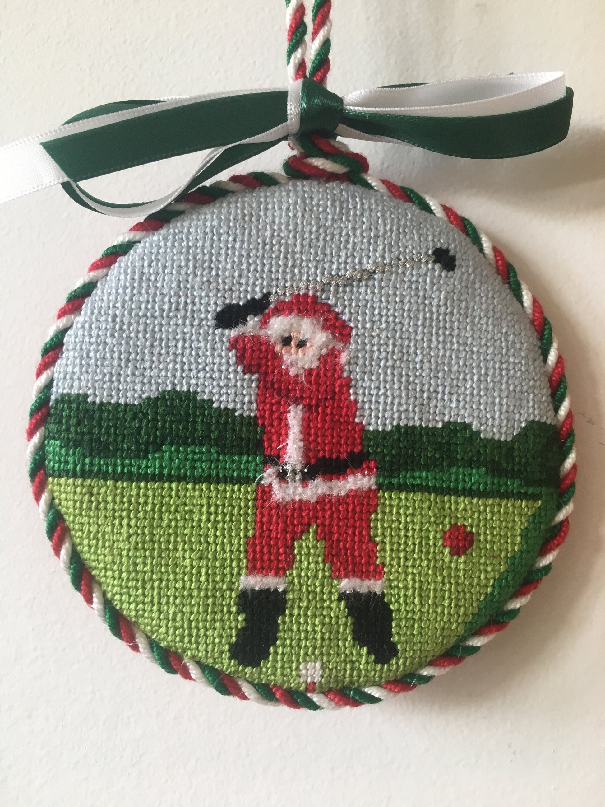 Sporty Santa hits the links! Golfing Santa is a 4.25” circle on 18 mesh. AOK 03