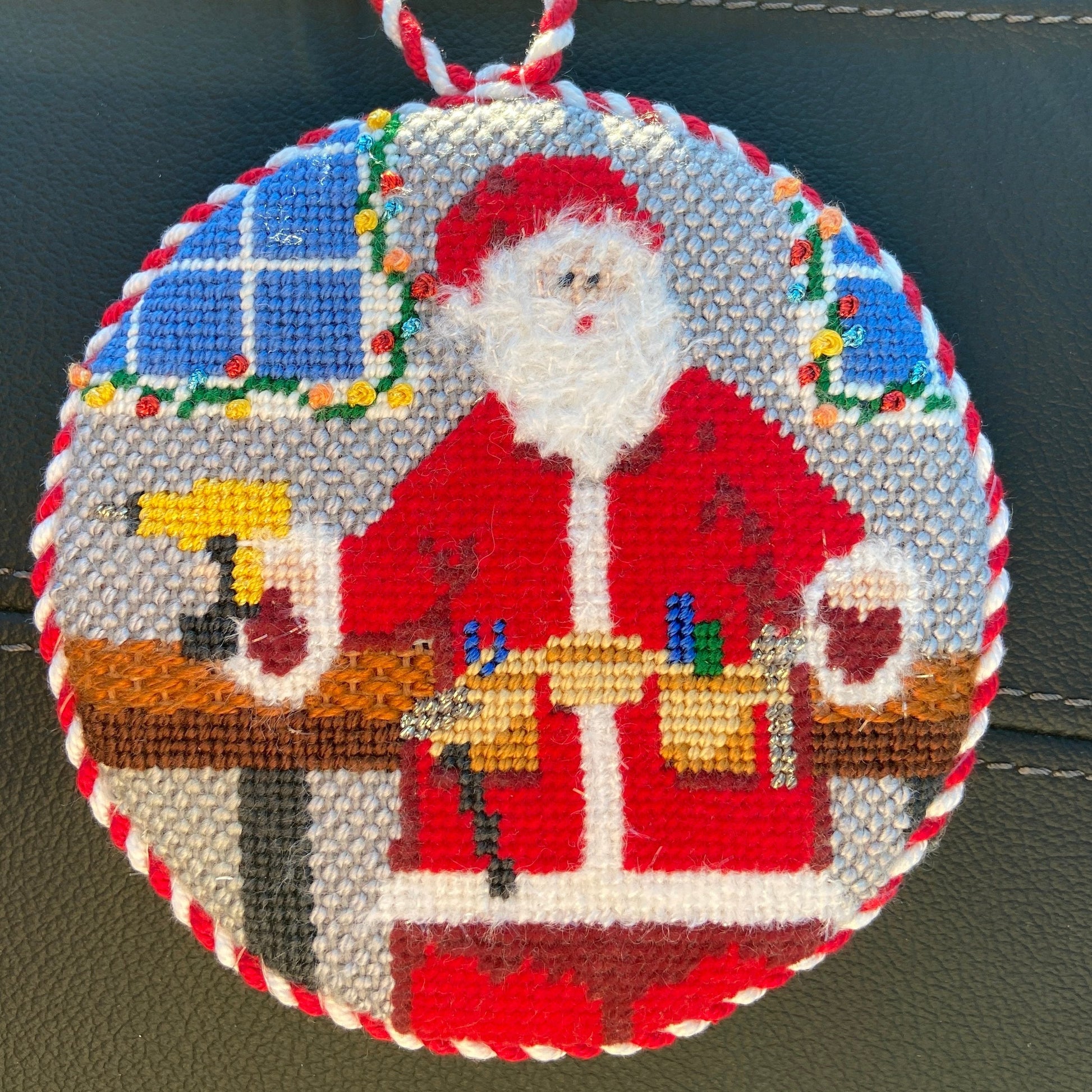 Santa couldn't be handier, making toys for all the good girls and boys. This fun 4” round on 18 mesh depicts Handy Santa at his basement work bench. AOK 94