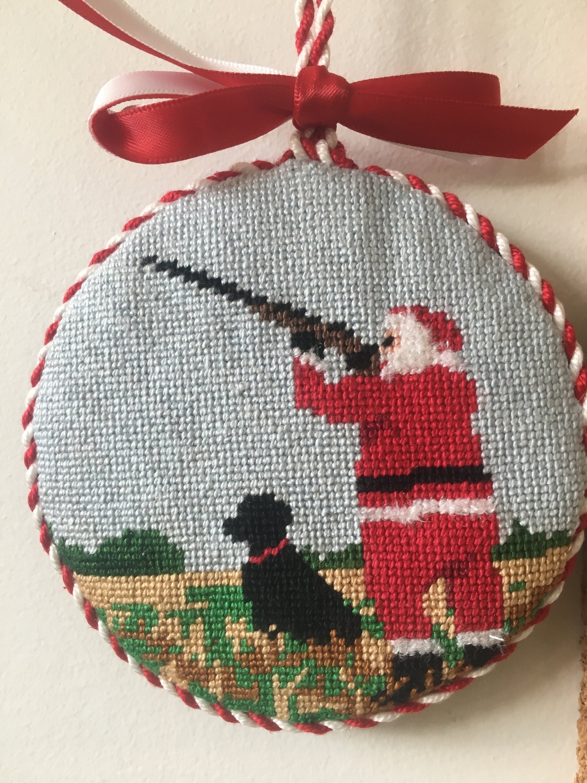 Clay pigeons are no match for Santa! Skeet Shooting Santa is a 4.25” circle on 18 mesh. AOK 05