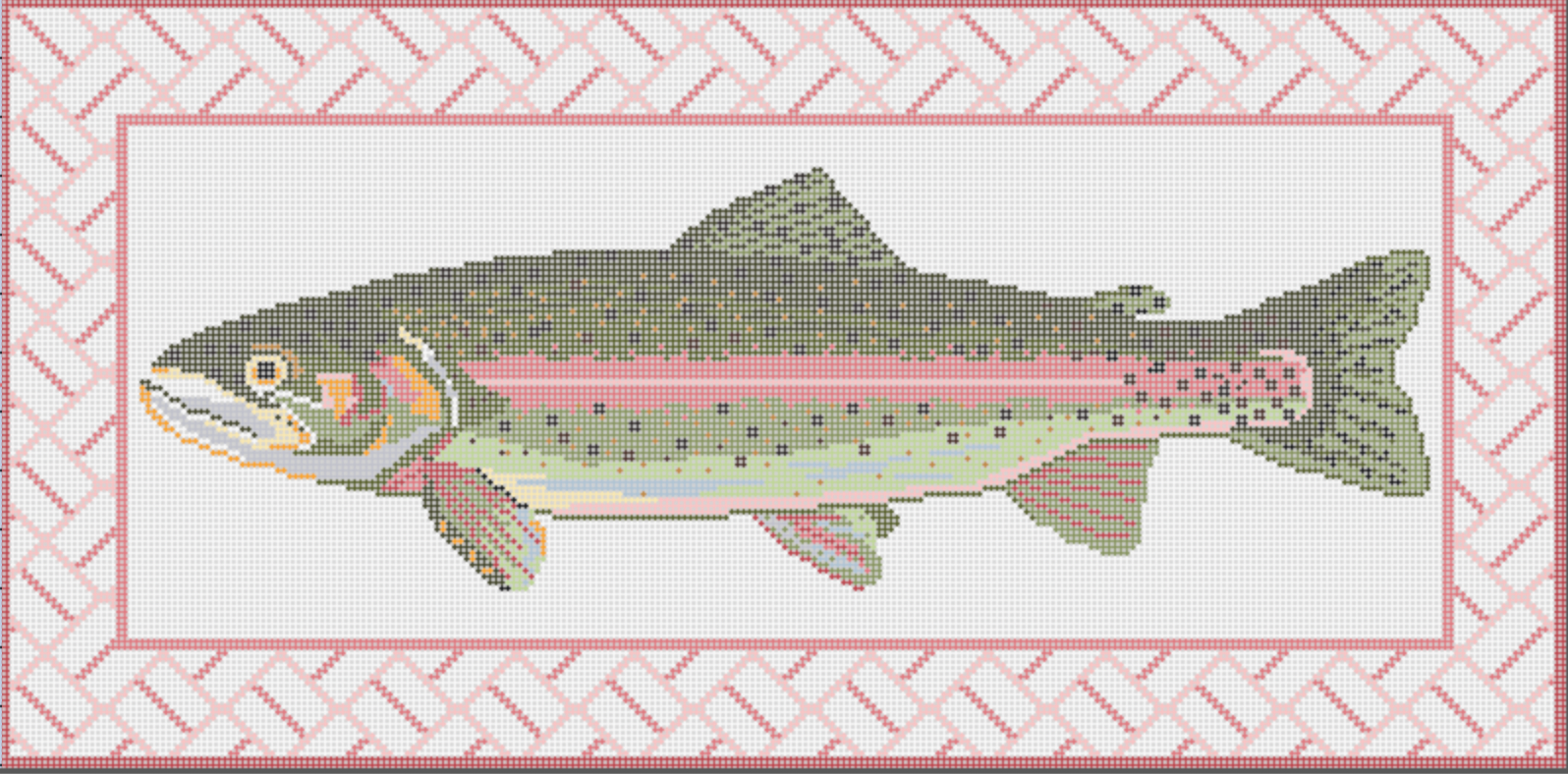 This beautiful trout bolster pillow, framed by a charming pink brick pattern, captures the majesty of the rainbow trout. Place it on your favorite fisherman's sofa, chair, or bed to remind you all of your favorite fish tales. The design is 20.5 x 10.1" on 13 mesh. AOK 258
